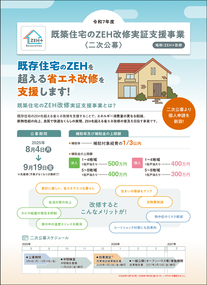 - 令和7年度 既築住宅のZEH改修実証支援事業|事業概要チラシ(二次公募)